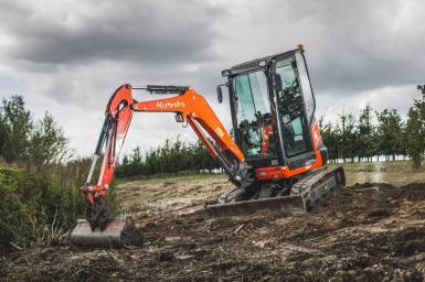 Der richtige Bagger für enge Baustellen/Gärten sowie in Gebäuden. Kontergewicht und Motorhaube sind so konstruiert, dass das Heck beim Drehen der Maschine nur minimal über die Ketten hinaus ragt. Bequemes wechseln von Löffeln/Anbaugeräten per Knopfdruck aus der Kabine. Der Powertilt ermöglicht sämtliche Anbaugeräte bis zu 90° Schwenkwinkel beidseitig (180°) zu bewegen.